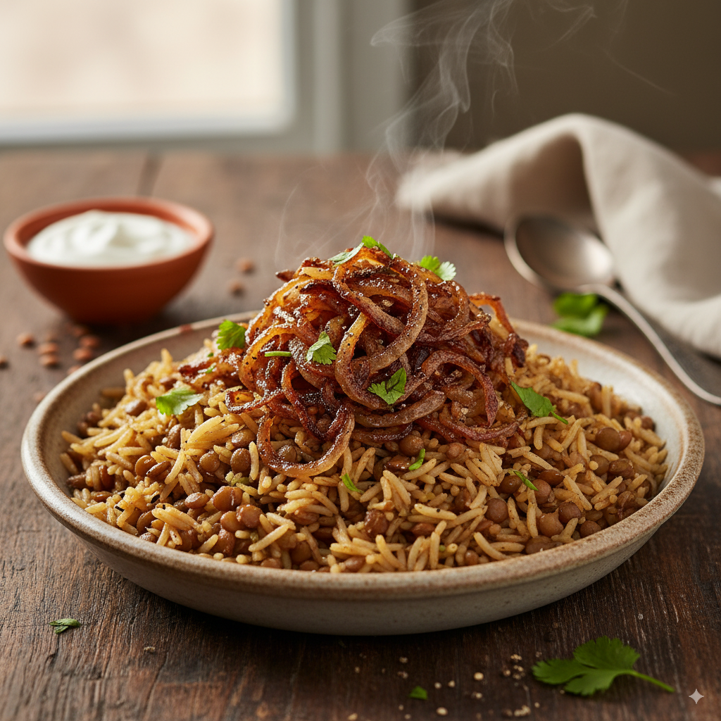 Rice with cooked lentils, sauteed onions, and spices.