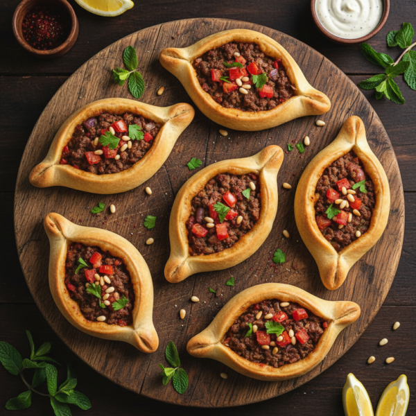 Also known as an “Arabic Pizza”. Dough with ground beef and tahini spread.